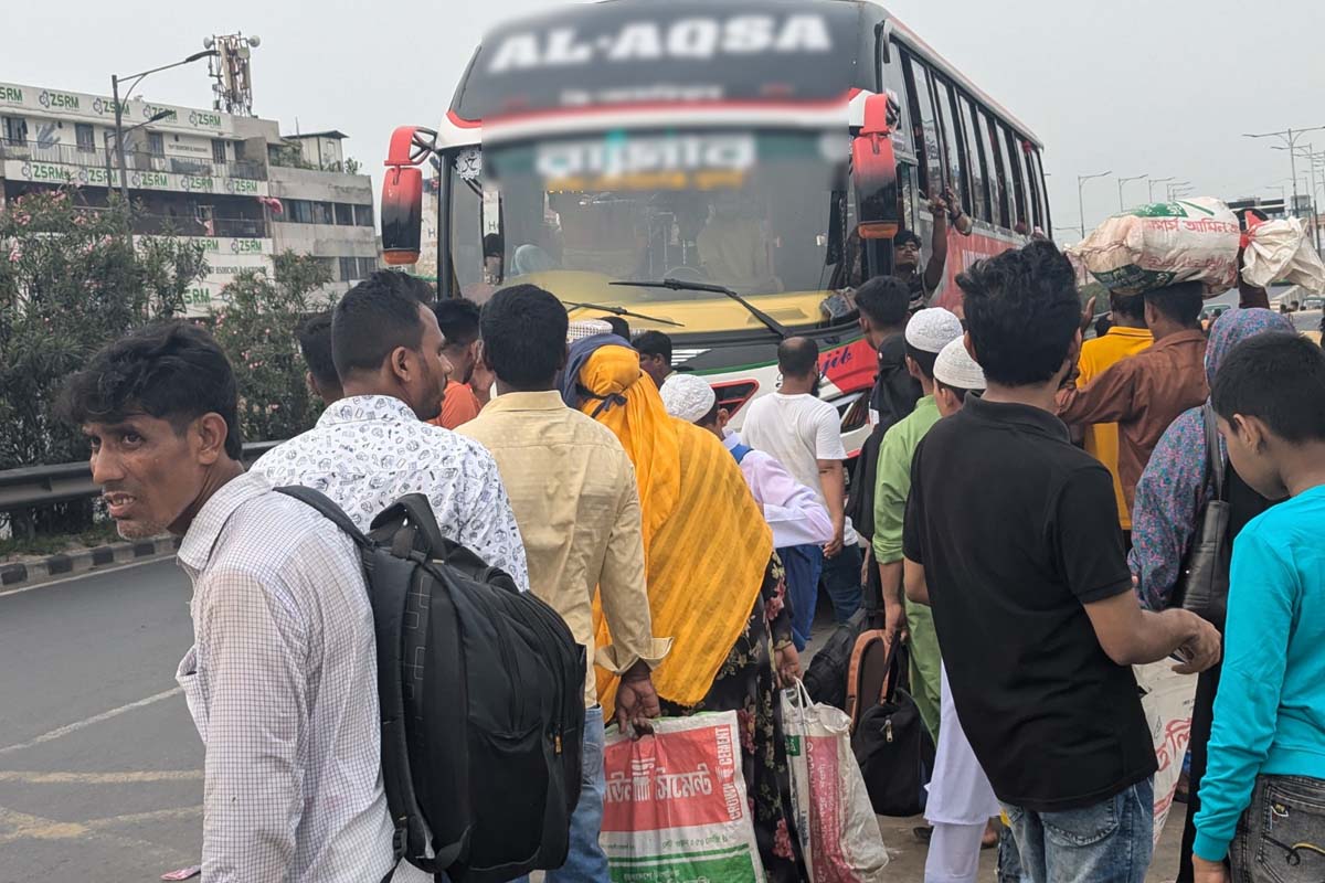 রাজধানীর বিভিন্ন টার্মিনালে দেখা গেছে, দূরপাল্লার যাত্রীরা টিকিটের জন্য হন্যে হয়ে ঘুরছেন। টিকিট পেলেও গুনতে হচ্ছে বাড়তি ভাড়া—কোথাও ২০০, কোথাও ৮০০ টাকা পর্যন্ত।