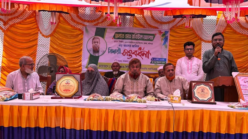 বিদায় অনুষ্ঠানে বিদ্যালয় মাঠে জড়ো হন সহকর্মী, শিক্ষার্থী ও স্থানীয় গণ্যমান্য ব্যক্তিবর্গ। অনুষ্ঠান শেষে বিদ্যালয় ও উপজেলা শিক্ষক সমিতির পক্ষ থেকে তাঁকে ফুলেল শুভেচ্ছা, সম্মাননা ক্রেস্ট ও উপহার সামগ্রী প্রদান করা হয়। পরে ফুলে সাজানো একটি প্রাইভেট কারে করে তাঁকে বাড়িতে পৌঁছে দেওয়া হয়।